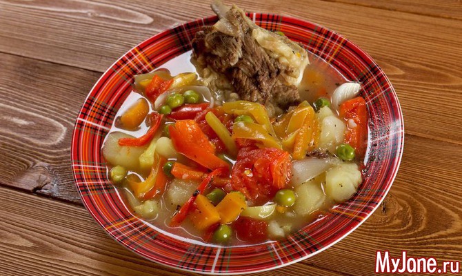 Когда мясо будет мягким, положите в кастрюлю нарезанные овощи и варите еще 15 минут до готовности. Посолите и поперчите суп по вкусу.
