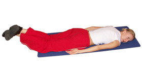Лежа на животе, руки вдоль туловища, голова на любом (удобном для вас) боку. Ноги скрещены так, чтобы правая нога находилась под левой, и приподняты над полом (фото 1).