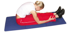 Из исходного положения, сидя на коврике, ноги вместе, наклонитесь к ногам (фото 3). При наклоне Вы должны почувствовать, как нарастает напряжение под коленом и на задней части бедра. Не делайте резких движений, растяжка должна быть плавной и без чрезмерных болевых ощущений.