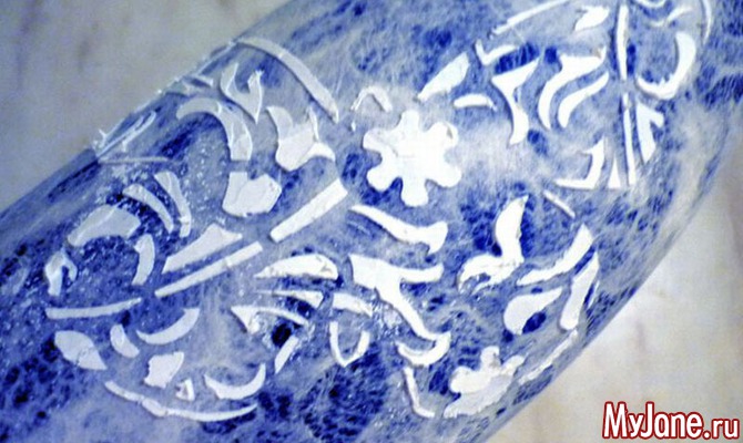 Бутылку моем, обезжириваем ацетоном или спиртом. Клей ПВА разводим наполовину водой и, отрывая куски от рисовой бумаги, приклеиваем ее на поверхность бутылки, проводя плоской синтетической кистью с клеем поверх оторванных фрагментов так, чтобы они хорошо пропитались. Если вы делаете из простых салфеток, то на этом этапе можно закладывать складки, узоры, завитки, формируемые из самой салфетки. Пропитанная клеем салфетка легко поддается кисти, и поэтому можно создать самые разнообразные узоры.