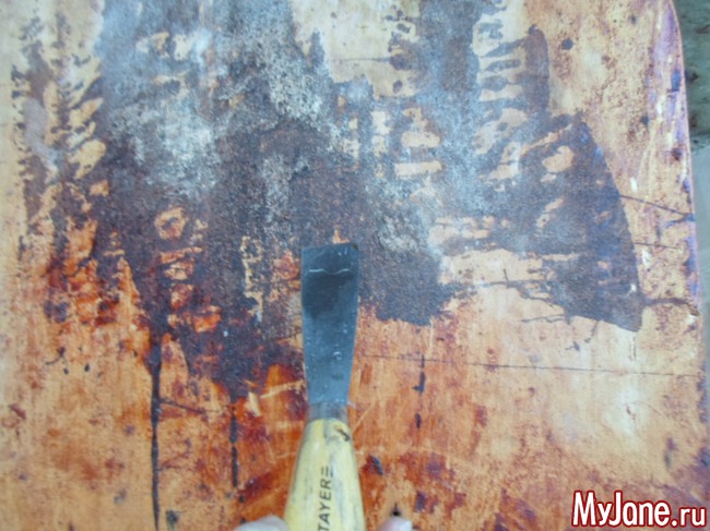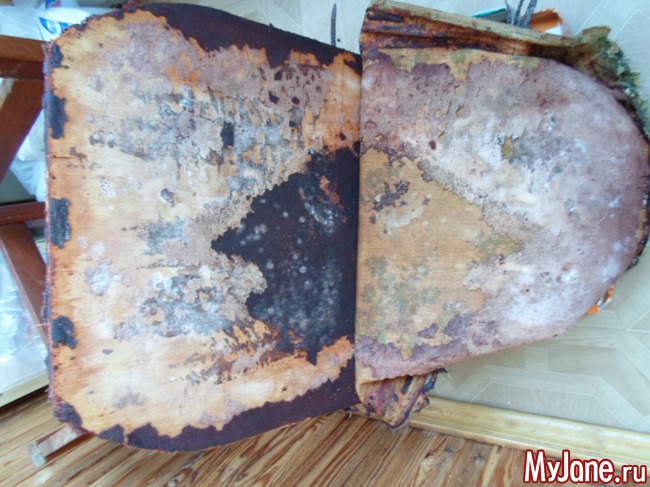 2. Снимаем сиденье и полностью удаляем обивку. Стул оказался довольно крепким, но обивка своё уже отжила, особенно внутренняя её часть. Весь поролон, который служил смягчающей прокладкой между фанерой и текстилем, разрушился и превратился в противную липкую субстанцию.