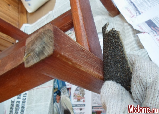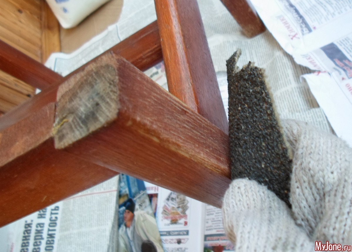 4. Приступаем к деревянной части стула. Счищаем наждачной бумагой весь лак, которым был покрыт стул. Краску желательно тоже максимально удалить. Конечно, можно воспользоваться шлифовальной машинкой, но у меня такой нет, поэтому пришлось потрудиться вручную – сначала очищала поверхность грубой наждачной бумагой, потом шлифовала мелкой. Не забудьте о защитных перчатках!