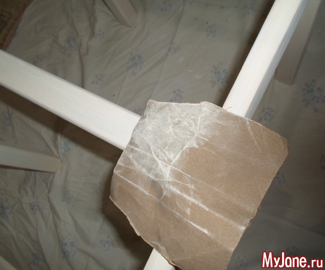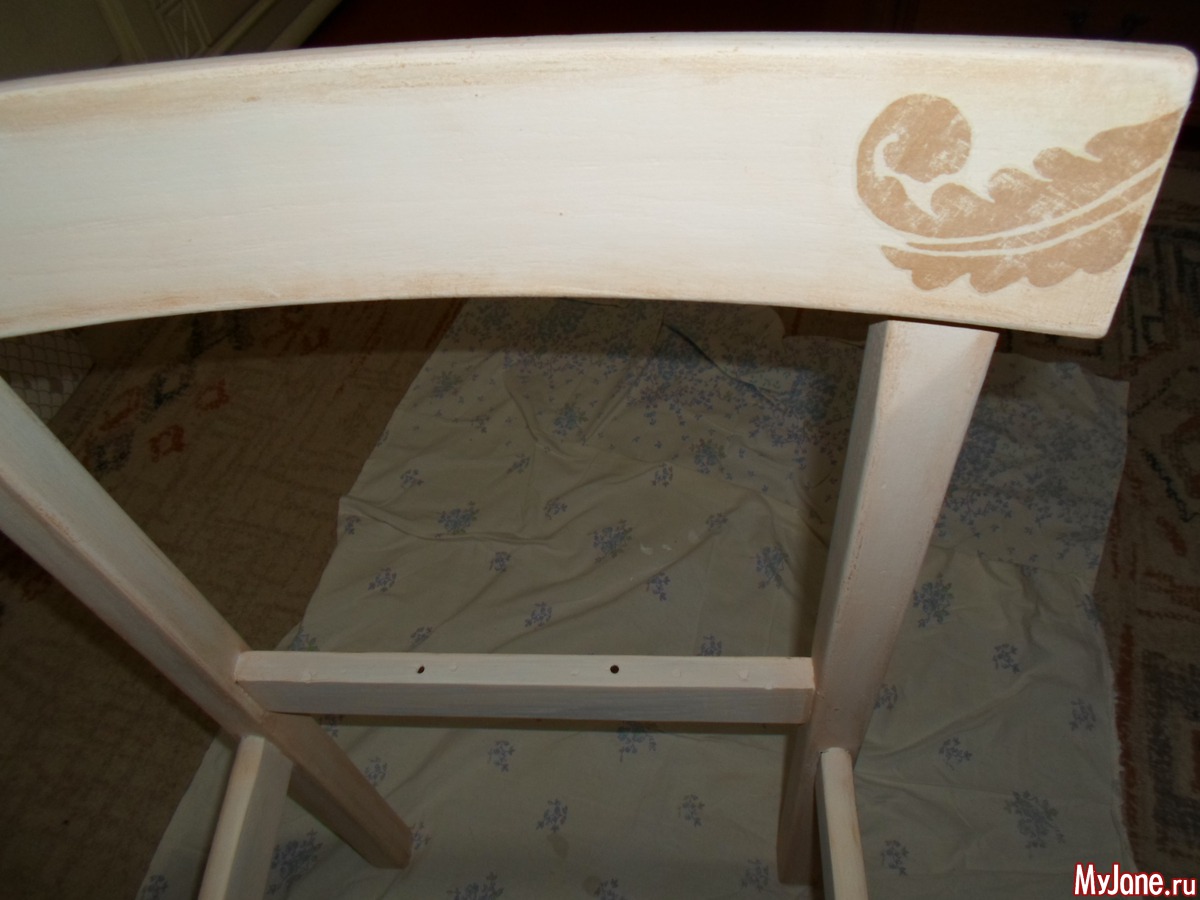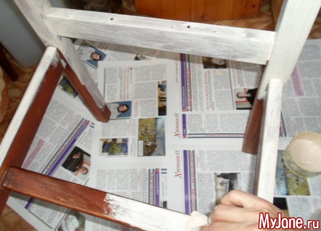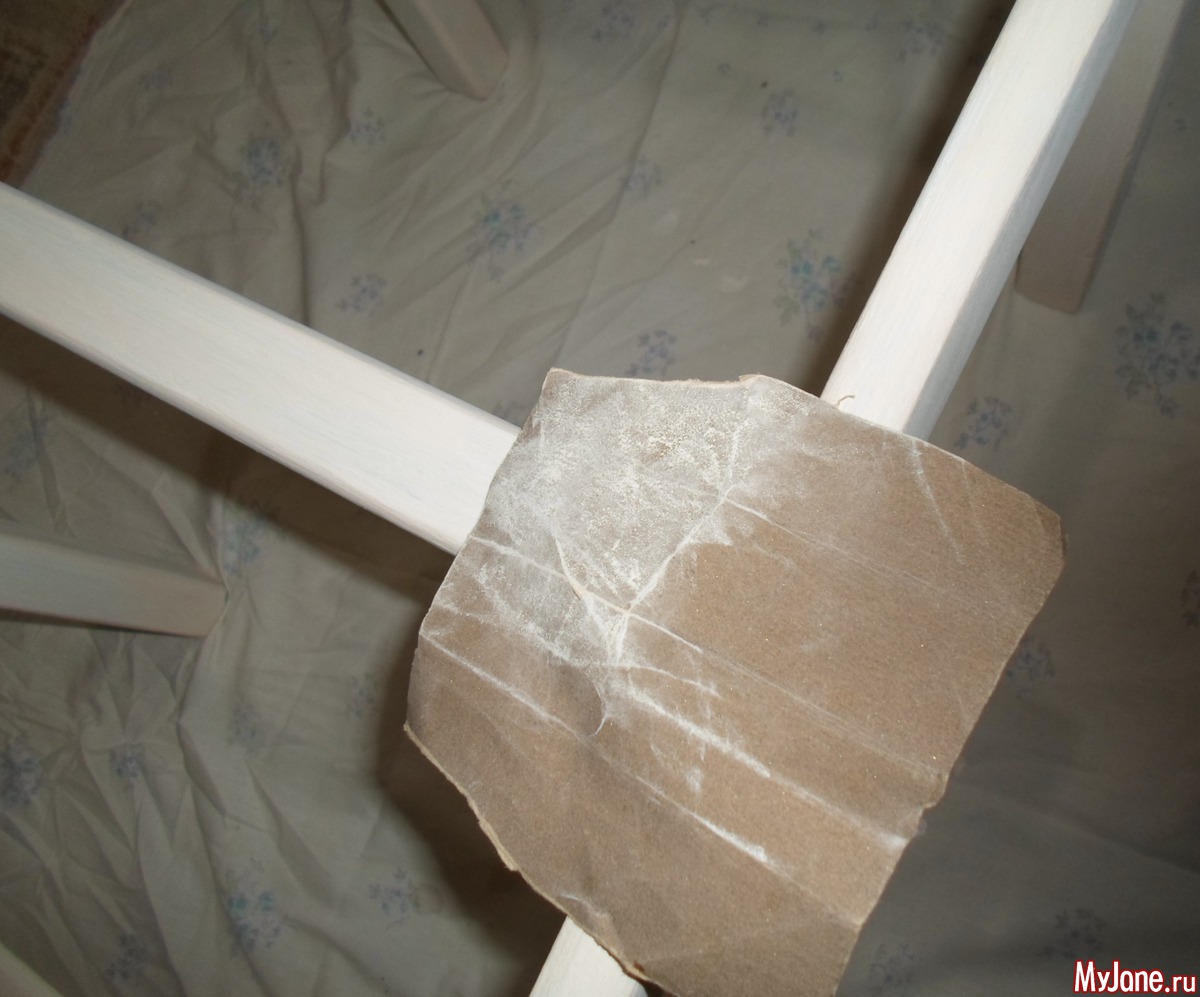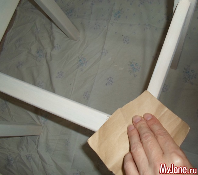 13. Покрываем всю деревянную поверхность стула несколькими слоями матового акрилового лака для мебели. Не забываем о промежуточной сушке. Лак сохнет довольно быстро – до получаса. При необходимости шлифуем мелкой наждачной бумагой наплывы лака или неровности и тут же убираем образовавшуюся пыль.