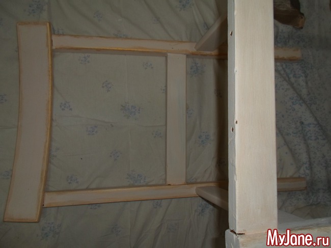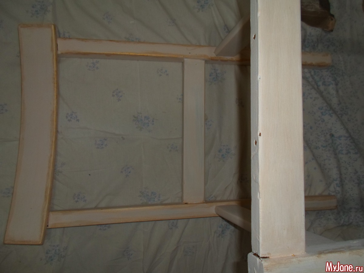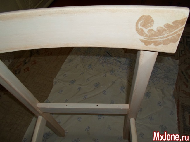 10. При помощи губки легкими прикосновениями наносим по всем рёбрам жёсткости и другим выступающим уголкам стула золотистую акриловую краску, как бы «пачкая» стул.