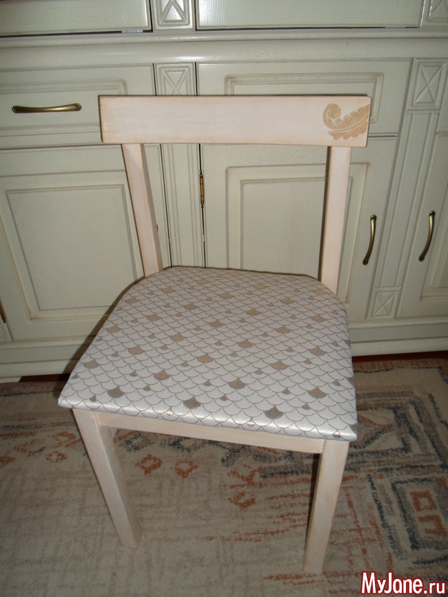 5. Стул готов к дальнейшему декору. Я решила сначала выбрать текстиль для обивки, а потом уже подбирать краску и отделку деревянной части стула. В комнате, где впоследствии пропишется новый стул, уже есть мебель цвета слоновой кости, а занавески пошиты из органзы с полосками золотистых оттенков. Поэтому я подобрала обивку в золотистых тонах, а деревянную часть стула решила покрасить в цвет, близкий к слоновой кости.