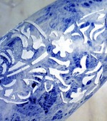 4. Окунаем яйцо в воду, чтоб оно было влажное, и обваливаем его в нарезанной смеси. На влажную скорлупу прилипли кусочки шелухи и бумаги. Кладем яйцо с прилипшими кусочками в лоскуток капронового чулка и завязываем его. В итоге получится окраска мраморного вида. Если потом положить окрашенное шелухой яйцо (не извлекая его из чулка) на минутку в раствор зеленки, то получим на нем изумрудные разводы.