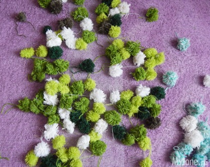 Теперь необходимо закрепить помпоны на сетке или ткани и обвязать по краю незатейливым рисунком. С помощью крючка продеваем нити от завязки помпона и узлом закрепляем на основе. Но можно использовать и плотную бязь, только придется повозиться с крепежом помпонов, их надо будет пришивать иглой.