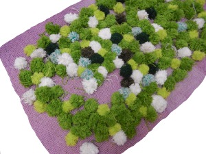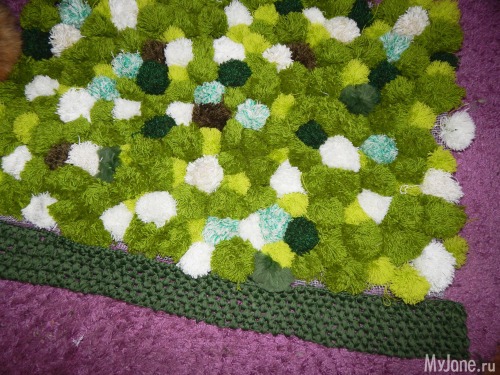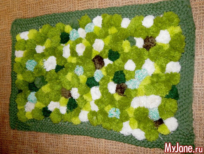 Отличный выход, когда трудно подобрать подходящий по цвету коврик, также с помощью помпонов можно сделать и наволочку на подушку, и замечательные игрушки, или придумать что-то своё.
