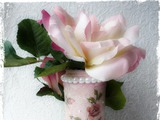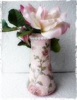 Мне нравится форма этой бутылочки, а вы можете выбрать любую из сохранившихся у вас бутылочек. Создадим вазочку для небольших цветов (например, кустовых или плетистых роз) в стиле шебби-шик или shabby shic, что переводится с английского как "потёртый шик". Стиль шебби-шик основан на идее имитации старины. Для него характерны светлые пастельные тона и цветочные мотивы. Потёртости, трещинки, облупившаяся краска, потрёпанные кружева – всё это непременные спутники этого стиля, раскрывающие понятие «потёртый», а вот розы, жемчуг, витиеватые узоры, гипсовые камеи, медальоны и рамочки раскрывают понятие “шик”. Любители декупажа часто прибегают к созданию своих работ именно в этом стиле.