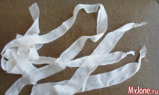 1. Рвем ткань на узкие длинные полоски. От ширины и длины полосок зависит размер будущей крученой розочки. Завязываем на одном из концов полосок узелки.
