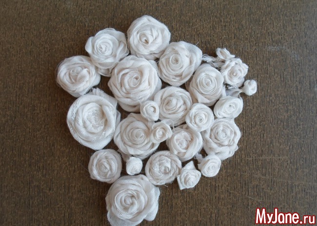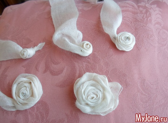 2. Формируем крученые розочки из полосок ткани следующим образом: делаем витки полоской ткани вокруг узелка, при этом периодически перекручиваем саму полоску ткани вокруг своей оси. Каждый из витков фиксируем ниткой, закрепляя на изнаночной стороне при помощи иглы маленькими незаметными стежками. Донышко розочки стараемся делать плоским.