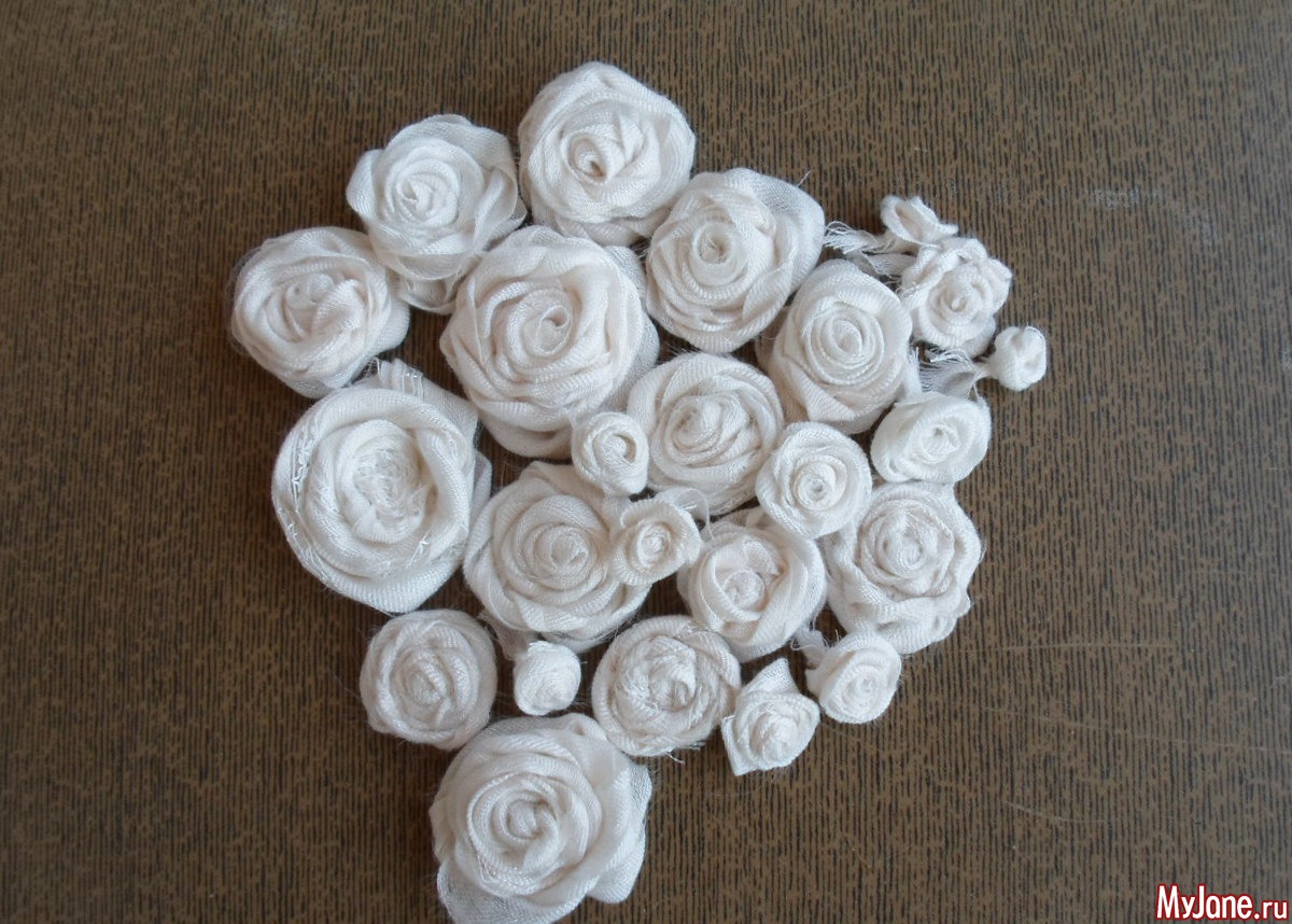 3. В зависимости от ширины и длины полосок получаются разные по размерам розочки. На любом из витков формирования розочки можно обрезать ткань и закрепить последний виток на изнанке – так регулируем диаметр цветка. Плотность (пышность) цветка тоже можно регулировать в процессе кручения.