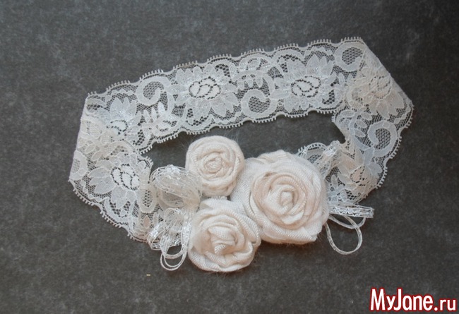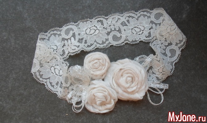 4. Из эластичного кружева или тесьмы формируем кольцо, немного меньше по обхвату, чем требуется. Если это повязка для волос – измеряем обхват головы, если это подвязка для невесты – измеряем обхват ноги. Закрепляем ручным швом края кружева.