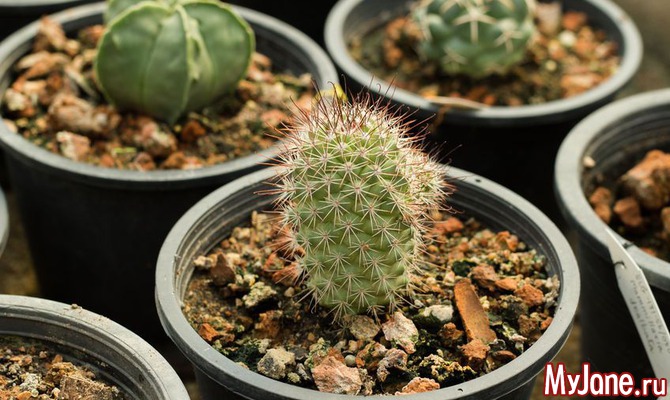 Почву для кактусов выбирают рыхлую, пористую, чтобы она хорошо пропускала воздух. Специалисты советуют такой состав – 1 часть дерновой земли, 1 часть листовой, 1 часть крупного, хорошо промытого речного песка с небольшими добавками древесного угля и кирпичной крошки из красного кирпича. Уголь лучше всего подходит берёзовый - сжечь толстую ветку или кусочек дерева и истолочь. Для кактусов с белыми колючками в смесь добавляют немного извести в виде мела или гипса. На дно горшка нужно положить слой гальки толщиной в 1 палец. При посадке кактуса следует аккуратно расправить его корни, чтобы они не были сбиты в кучку. Пересаживать кактусы специалисты советуют весной, в марте-мае. Молодые кактусы пересаживают каждый год, а взрослые - 1 раз в 2–3 года. При пересадке не рекомендуется сильно утрамбовывать землю. После пересадки растение в течение недели не поливают. Пересаженные кактусы можно накрыть стеклянной банкой. Подкармливают кактусы очень осторожно. И лучше купить в магазине готовое удобрение для кактусов и действовать соответственно приложенной инструкции.