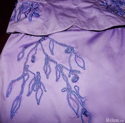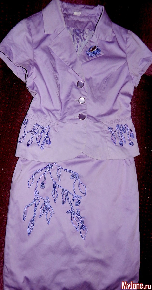 Так получилось, что любимый костюм был безнадежно испорчен. Невыводимые пятна были разбрызганы по всей поверхности юбки, а при стирке вместе с пятнами пропадал и цвет ткани. Долго думала, как исправить это, так как сдаваться не хотелось, а носить костюм было уже нельзя. Так как я ничего не теряла, приступила к реставрации. Для начала попыталась использовать маркер по одежде, но попытки были неудачными, пятна были видны. Пришла идея использовать сутаж, и так как костюм был однотонный, нанести орнамент было позволительно.