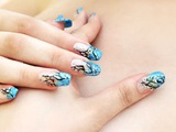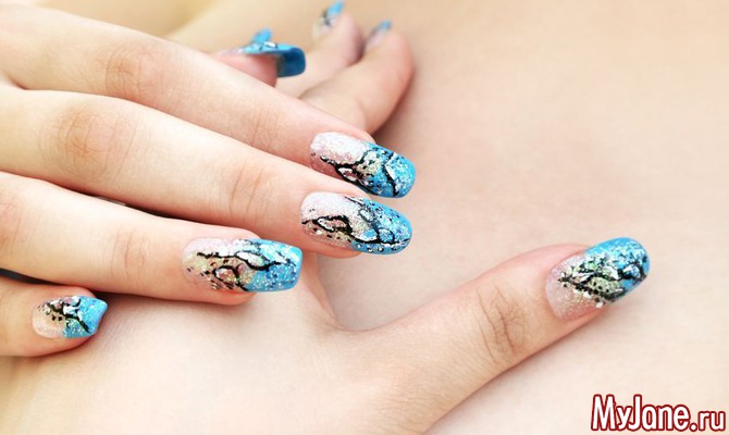Либо можно использовать еще одну технику - водный или мраморный маникюр. В емкость с водой комнатной температуры капните несколько цветных лаков один в другой, чтобы, растекаясь по воде, они создали разноцветную пластинку. Затем зубочисткой или иголкой заверните спираль или линии вразнобой, чтобы получился узор. Обработав кожу вокруг ногтей жирным кремом, подденьте ногтями получившийся узор и уберите лишний лак.