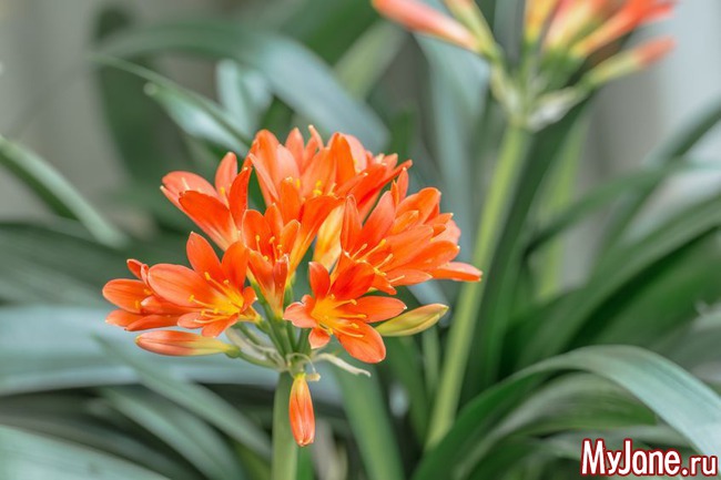 Кливия попала к нам из Юго-Восточной Африки. Красота ее - в крупных (до 4 см) колокольчатых цветках оранжевого, беловато-желтого или же красного цвета. Они находятся в зонтичных соцветиях по тридцать штук, которые впечатляюще смотрятся на фоне изогнутых, изящных мечевидных листьев темно-зеленого цвета, достигающих подчас до одного метра. Не менее интересны и плоды этого растения – ягодообразные ярко-красные коробочки с единичными семенами, период созревания которых колеблется от 8 до 10 месяцев.