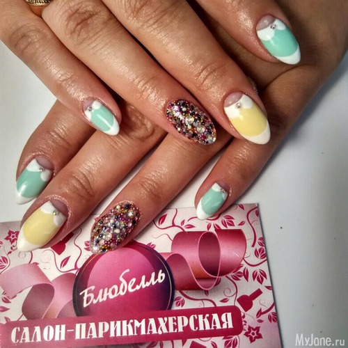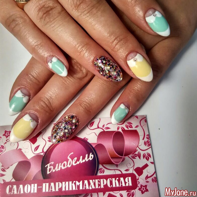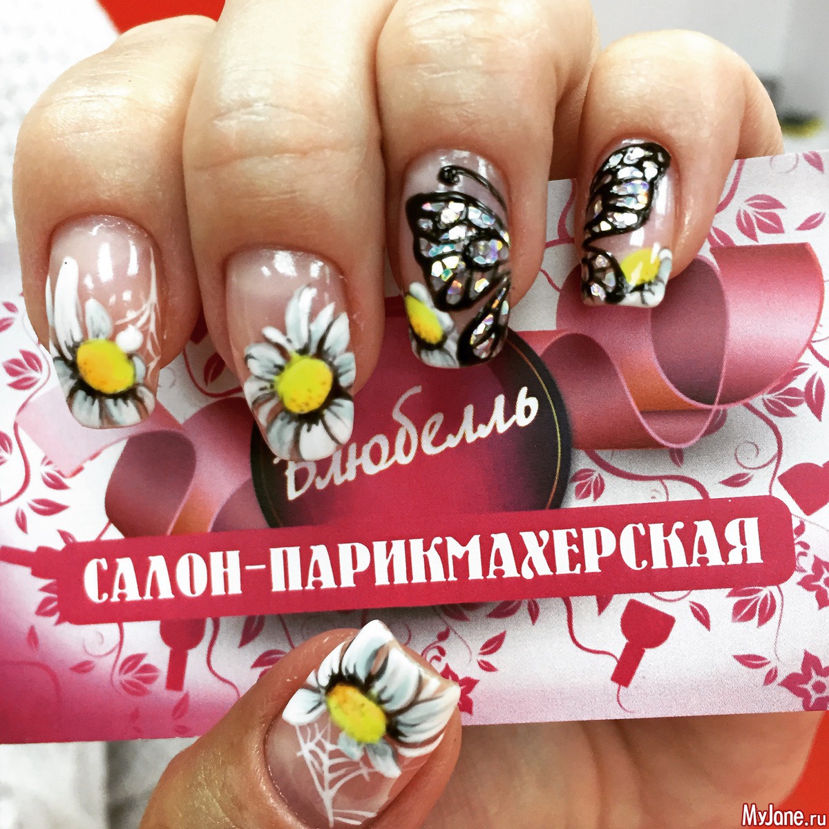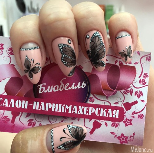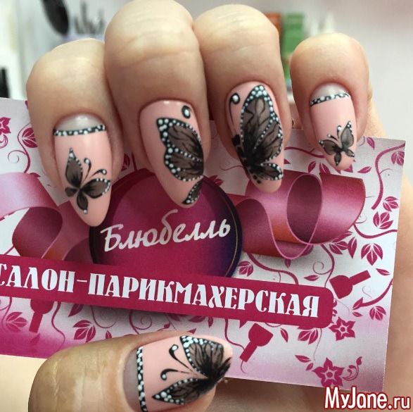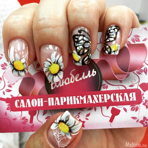 Это слово можно написать как на одном ногте, так и разбросать буквы от мизинца до указательного пальца. Буквы можно стилизовать стразами или окантовкой другим цветом, либо украсить лианой с простыми каплевидными листьями. Лиана рисуется легко - волнистая линия вокруг буквы и потом сажаете на нее примитивные листочки. Снова лучше рисовать лаками для дизайна с тонкой кисточкой.