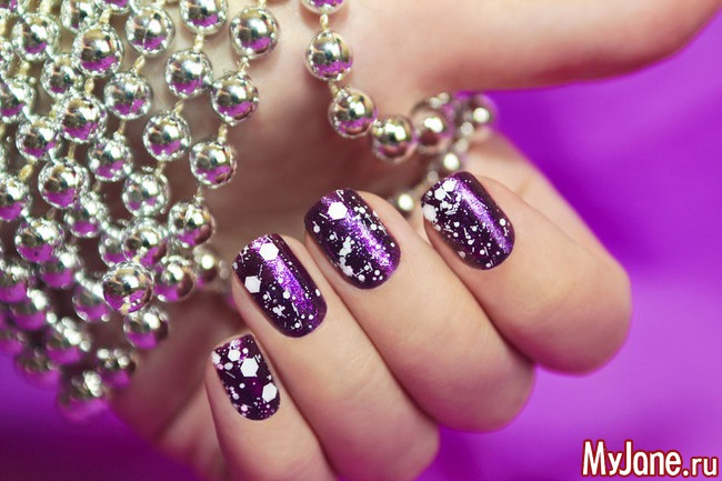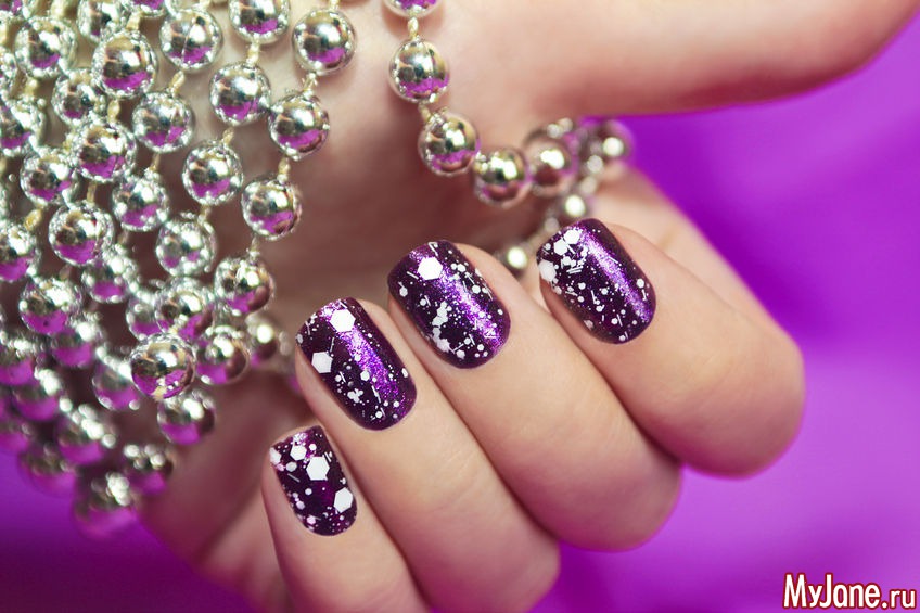 Чтобы сделать дизайн ногтей в космическом стиле, покройте ногти черным лаком, после чего нанесите поверх разные лаки с блестками и нарисуйте белые звездочки разного размера. Для большего мерцания можно использовать рассыпчатые блестки для ногтей, которые втираются небольшими пятнами и создают очень красивый эффект звездных скоплений. Не забудьте покрыть готовый дизайн топом, чтобы усилить мерцание и продлить время носки маникюра.