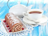 Рулет развернуть, снять бумагу, пропитать тёплым сиропом, выложить тонким слоем варенье. Свернуть рулет и положить швом вниз.