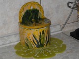 От салфетки отделить цветной слой и вырезать понравившийся фрагмент. С помощью кисточки и клея ПВА аккуратно, не допуская пузырей, приклеить к солонке. С помощью краски дополнить рисунок, добавив яркости, сочности.