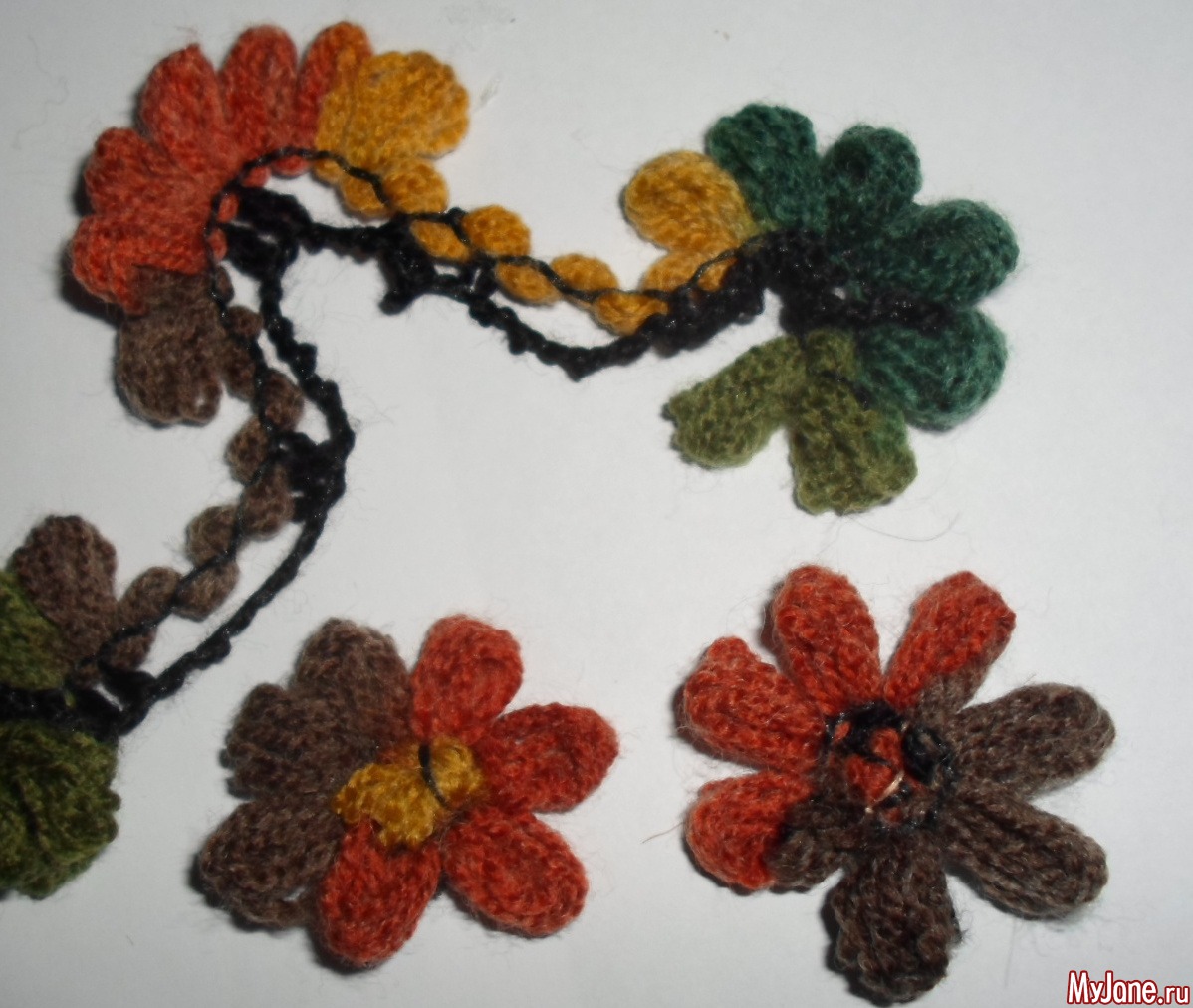 2. Отрезаем от пряжи по одному фрагменту с петлями и формируем цветочки. Петли пряжи превращаются в лепестки цветка. Закрепляем несколькими стежками форму цветка. Некоторые цветочки я формировала с серединкой из пряжи, а некоторые делала плоскими – их я впоследствии украсила бисером и янтарем.