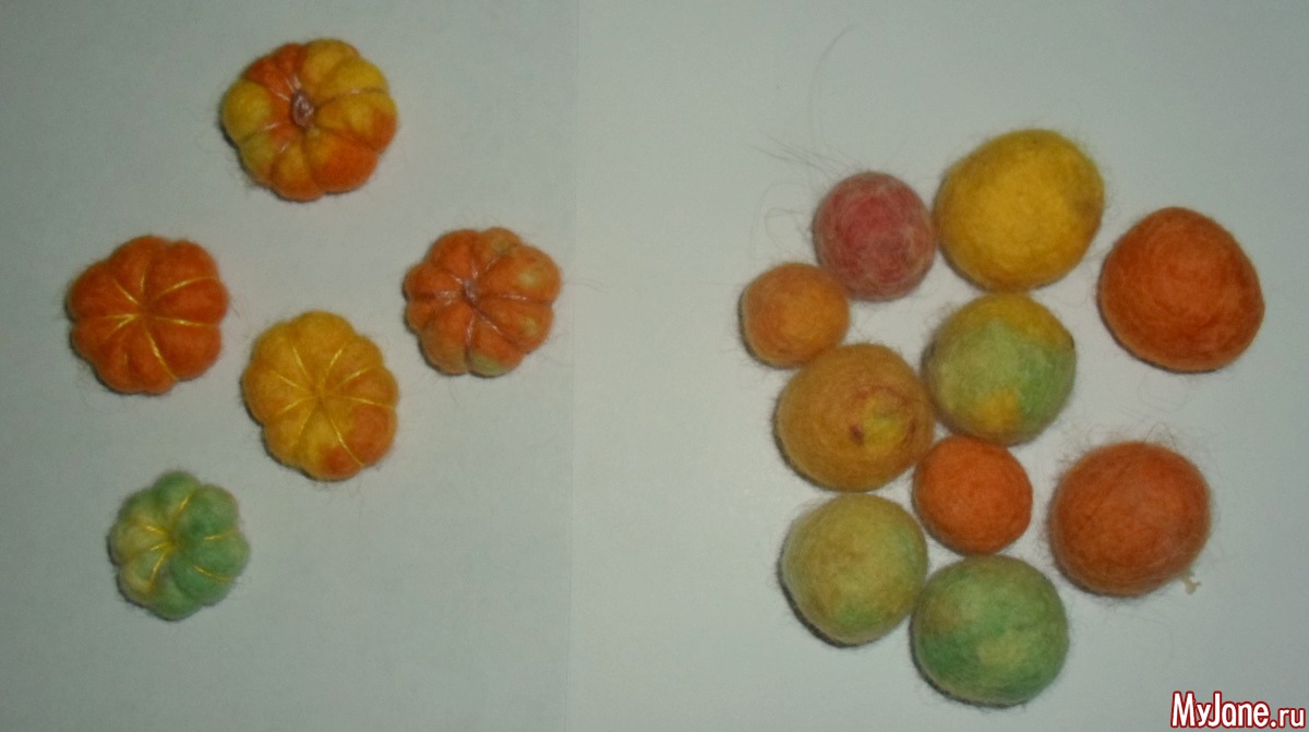 3. Из шерстяного шарика сформируем ё-ёшку (тыковку), чтоб разнообразить брошь. Но это совсем не обязательно, вполне можно пропустить этот этап. Вот так делаются ё-ёшки из шерсти, подробно можно посмотреть в предыдущем моем мастер-классе по изготовлению броши с тыковками