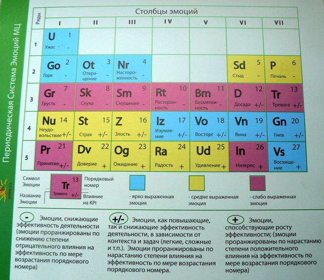 Она представляет собой таблицу, в ячейки которой вписаны те же упомянутые выше 27 эмоций, что и на шкале термометра эмоций. Однако в периодической системе они представлены со знаками «+», «-» или «+/-». Со знаком минус выделены те эмоции, которые снижают эффективность деятельности и подлежат устранению в случае возникновения. Обратите внимание, что по мере возрастания порядкового номера таких эмоций снижается степень отрицательного влияния на вашу эффективность. Со знаком плюс, наоборот, приведены те эмоции, которые способствуют росту вашей эффективности. Возрастающий порядковый номер такой эмоции расскажет вам о нарастании степени положительного влияния на вашу эффективность. Что же касается эмоций с двойным знаком, то они в зависимости от ситуации могут как снижать, так и повышать эффективность вашей деятельности.