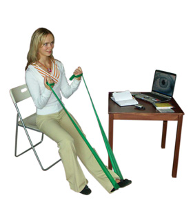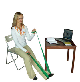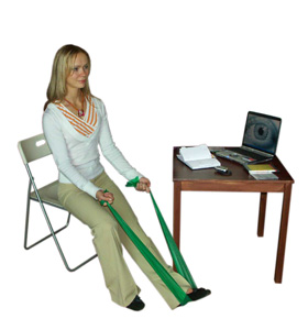 Сядьте на стул, возьмитесь руками за концы амортизатора, подложив его середину под левую стопу. Выпрямите левую ногу, направив носок на себя, а правую ногу поставьте стопой на пол.