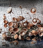 Вам потребуется: упаковочная однотонная бумага, клей, небольшие шишки, еловые веточки, спрей-краска серебряная или золотая, спрей с искусственным снегом (не тающим), палочки корицы, цельные цветы аниса, несколько высушенных круглых ломтиков апельсина или лимона.