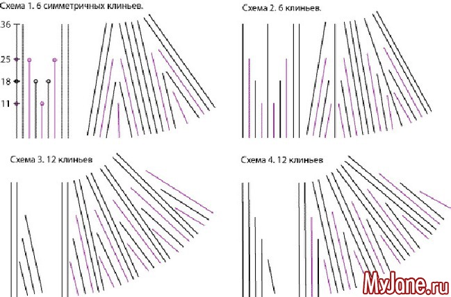 На схемах 1 и 2 показана разная последовательность неполных рядов в шестиклинке. В одноцветном полотне различия будут почти не видны, при использовании ниток разных цветов получатся очень разные узоры. На схемах 3 и 4 приведены варианты из 12 клиньев, равноценные в одноцветном варианте, очень разные – в многоцветном.