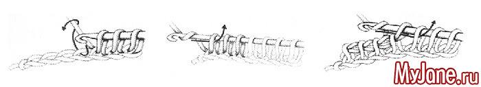 По линии низа сделать один ряд столбиков без накида (и один отделочный ряд «рачий шаг») обычным крючком.