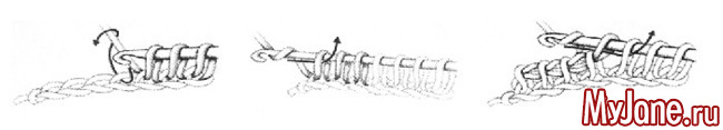 Для первого ряда набрать расчетное количество петель (в образце 15), из каждой петли цепочки, начиная со второй от крючка, вытянуть по петле и оставить их на крючке (на крючок наберется столько петель, сколько их было в цепочке). Не поворачивая работу провязать последовательно все набранные петли, сначала один раз последнюю набранную петлю, затем по две петли, пока на крючке не останется одна петля, она же начальная петля следующего ряда.
