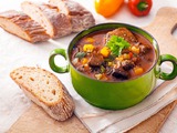 Всыпать паприку, нарезанные крупными кусками шампиньоны, помидоры, томатную пасту, фасоль, посолить, поперчить, залить овощным бульоном, тушить примерно полчаса.