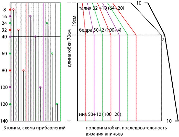 Для удобства вязания рекомендуется сделать схему прибавлений по трем клиньям. При 7 рядах на талии и 10 рядах по низу юбки удобно связать в каждом клине 2-ой, 5-ый и 8-ой ряды неполной длины. Расширение получится плавным и менее заметным если места прибавлений в клиньях не совпадают по высоте. Длина рядов и последовательность вязания клиньев показаны на схеме.