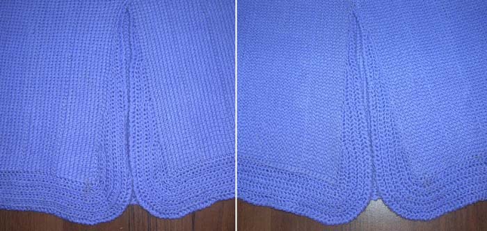 Готовое полотно отпарить с изнанки и соединить первый и последний ряды ниткой с иголкой. Нижнюю часть шва не сшивать, оставить разрез 25 см.
