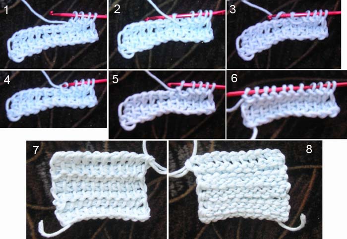 При выполнении наборного ряда нить перекинуть на лицевую сторону полотна (1), ввести крючок справа налево под вертикальную петлю предыдущего ряда (2), подхватить нить (3) и протянуть ее через петлю (4, 5 и 6). Закрывать петли попарно, как в плетенке. Лицевая (7) и изнаночная (8) стороны полотна. Два ряда плетенки чередуются с одним рядом изнаночной тунисской петлей.