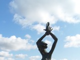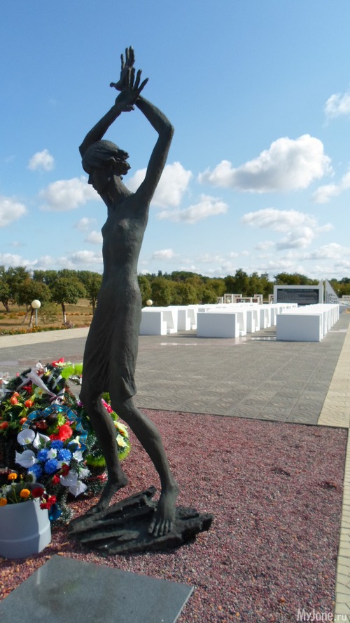 Худенькая, со вскинутыми вверх руками – то ли в мольбе, то ли защищаясь.. Она – это все погибшие дети на земле. И хоть бронзовая скульптура гораздо выше роста взрослого человека, эта фигурка создает впечатление беззащитности и хрупкости.