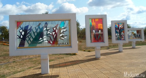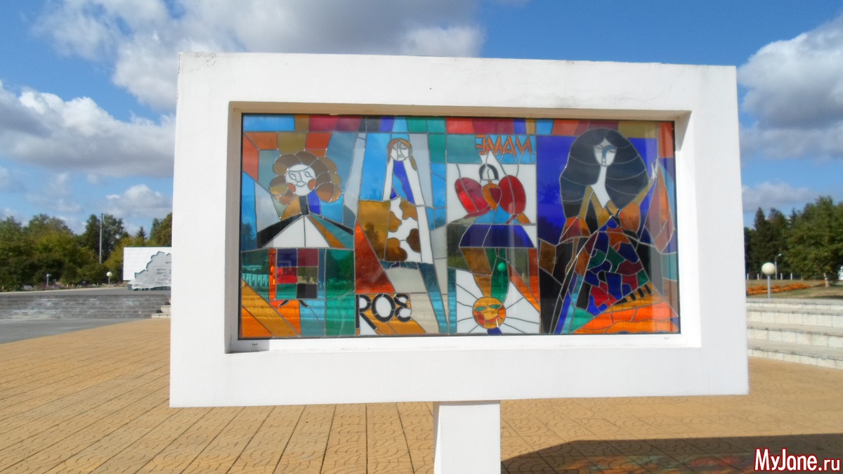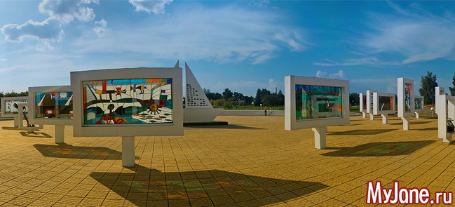 Центром и главной идеей композиции является Площадь Солнца, на которой высажен яблоневый сад. Здесь же сверкают всеми цветами радуги стеклянные витражи, сделанные по рисункам детей, пережившим ужасы войн.