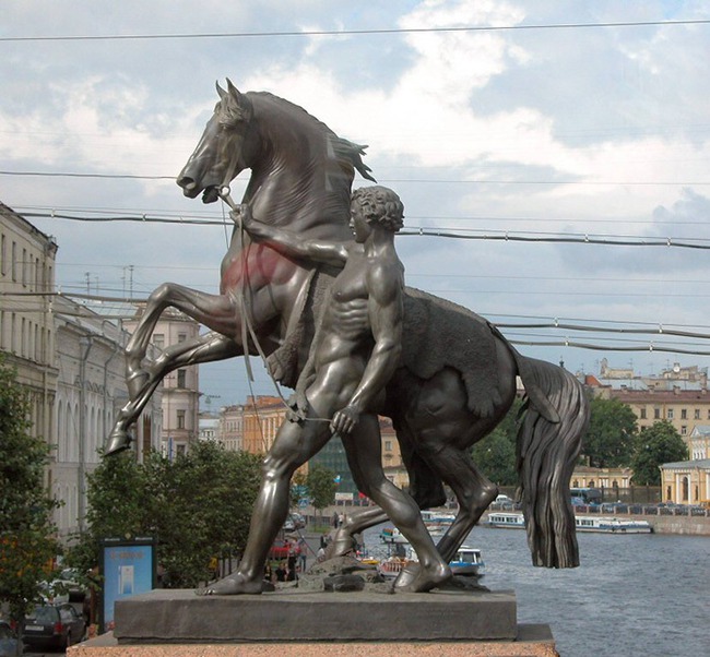 Сразу за этим дворцом вы увидите Аничков мост через реку Фонтанку. Он знаменит четырьмя скульптурами коней, которых укрощает атлетический юноша. Их автор – знаменитый скульптор Клодт. Царь Николай I, восхищавшийся исключительным мастерством скульптора, однажды пошутил: «Клодт, ты делаешь лошадей лучше, чем жеребец!»Кони Клодта