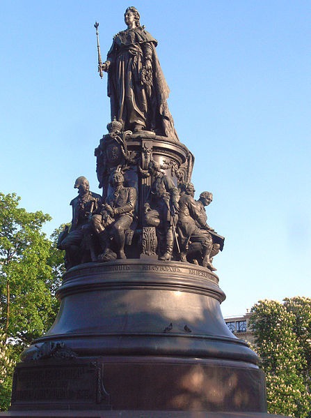 Прямо напротив Елисеевского магазина расположен Екатерининский сад, в центре которого стоит величественный памятник Екатерине Второй. Императрица в горностаевой мантии возвышается на постаменте, а ниже стоят видные государственные деятели той эпохи: Григорий Потемкин, Александр Суворов, Гавриил Державин, Екатерина Дашкова и др.