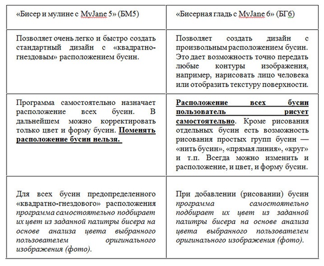 Другими словами, «Бисерная гладь с MyJane 6» – это программа самостоятельного рисования бисером поверх имеющейся картинки на “компьютерном” полотне с компьютерной реализацией операций подбора цвета бисера, контроля и корректировки перекрытия бусин, автоматическим добавлением точек прокола иглы, возможностью отмены \ повтора последних действий (undo \ redo) и т.п. «Бисер и мулине с MyJane 5» – это программа полного компьютерного создания схем вышивки бисером, включая назначение программой координат расположения всех бусин схемы. Поэтому сделать схему вышивки в программе «Бисерная гладь с MyJane 6» заметно сложнее и дольше, чем в «Бисер и мулине с MyJane 5». Для успешной работы в программе «Бисерная гладь с MyJane 6» от пользователя требуется гораздо больше художественных навыков. Но и возможностей по художественному дизайну схемы у «Бисерная гладь с MyJane 6» на порядок больше, чем у «Бисер и мулине с MyJane 5».