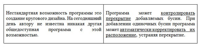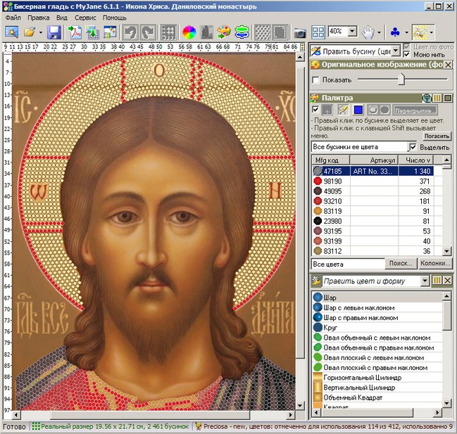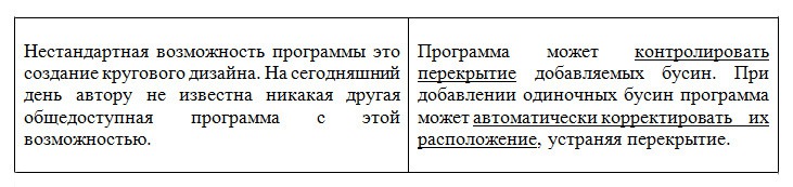 В настоящее время имеется несколько общедоступных программ для создания схем вышивки бисером. К ним относится, например, отечественная программа «Бисер и мулине с MyJane 5». Имеются и другие программы, в том числе и англоязычные, например, BeadCreator. Однако все имеющиеся программы имеют существенное ограничение – бусины схемы могут быть расположены только в строго определенных местах, повторяющих позиции клеточек в ученических тетрадях. Такой предопределенный “квадратно-гнездовой” рисунок расположения бусин не имеет отношения к художественному замыслу схемы и носит просто технологический характер. Но это технологическое ограничение не позволяет подчеркнуть имеющиеся контуры изображения (овал лица). Наоборот, такой порядок расположение бусин создает иллюзию наличия сетки из вертикальных и горизонтальных линий, внося определенное искажение в любую схему, созданную по исходной картинке.