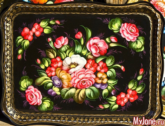 В этом ряду выделяется и жостовская роспись – декоративная живопись маслом на металлических подносах, покрываемых затем лаком; букеты и фрукты исполнены яркими красками энергичными и упругими мазками на черном или цветном фоне.