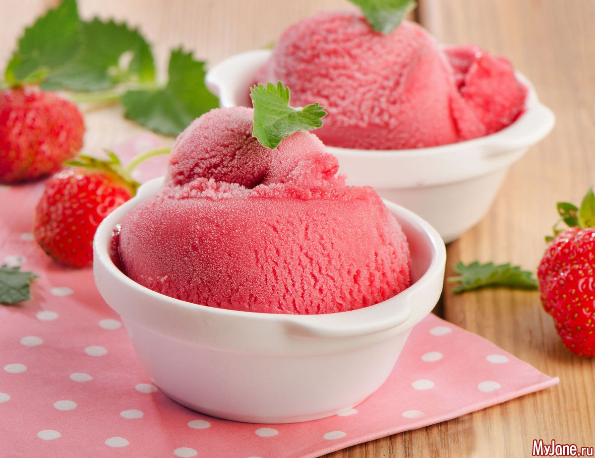 Выложить на блюдо. Сверху – мороженое. И украсить свежими ягодами клубники.