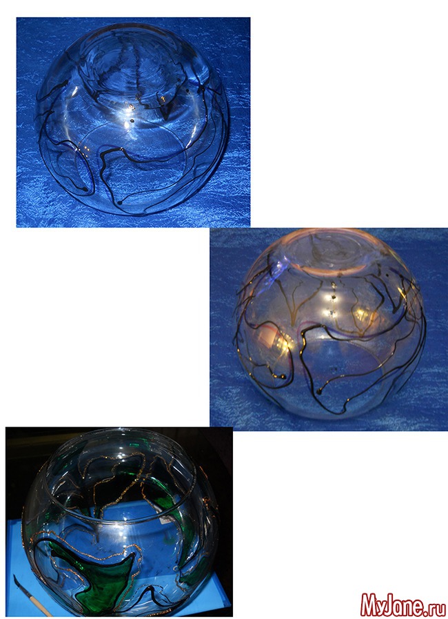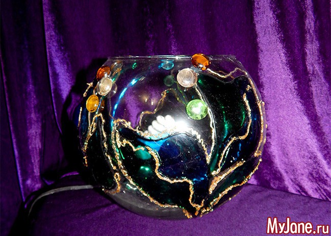 Наносим маркером рисунок, и обводим его черным контуром. После того, как он высохнет заполняем витражными красками. Ждем полного высыхания, и после этого украшаем стеклярусом, который напоминает пузырьки воздуха.