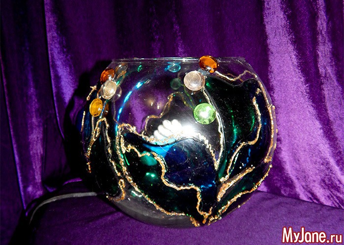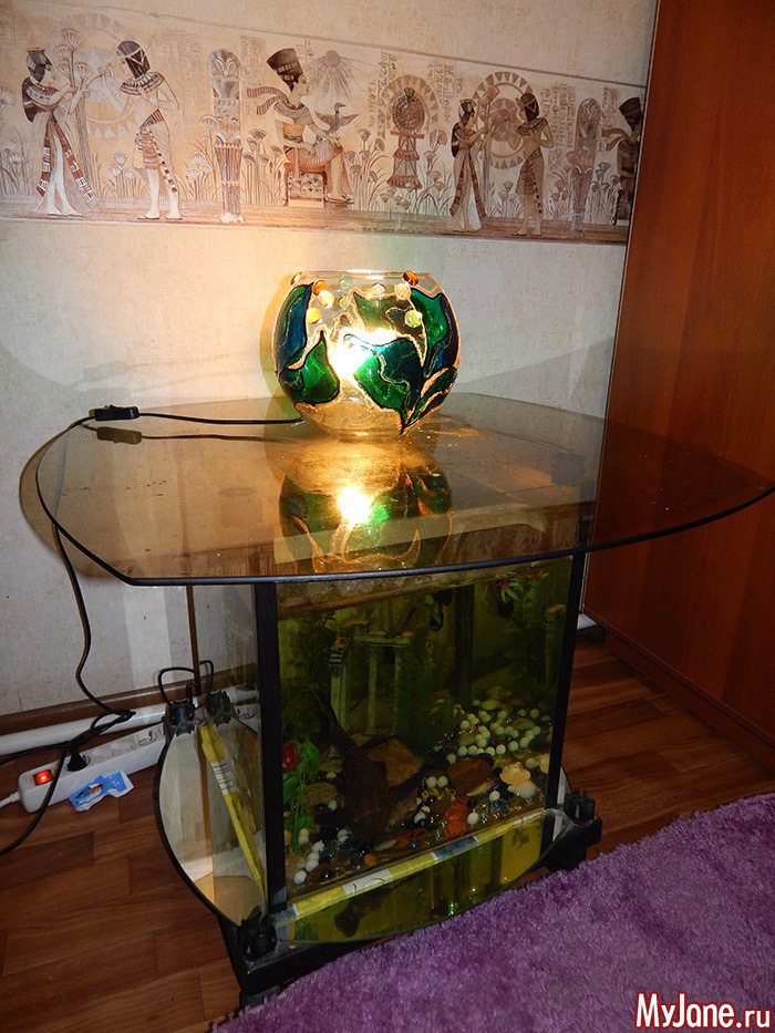 Приметив емкость, которую можно было назвать вазой, так как это была прозрачная сфера без каких-либо элементов декора, созрела идея. В такую емкость можно положить красивые сухоцветы, камни, ракушки, но мне она напоминала мою разбитую настольную лампу. Она также служила и освещением для аквариума, который я ранее сделала, используя за основу журнальный стол. Рыбки грустно поедали корм в полумраке основного освещения.