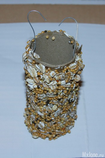 Вырезав из картона сердечко, домик, да всё, что душе угодно и пропустив веревочку, намазываем клейстером одну сторону. Поверх насыпаем разный корм, тут уже простор вашей фантазии, даём высохнуть. Тоже проделываем с другой стороной. Вот, что у нас получилось.