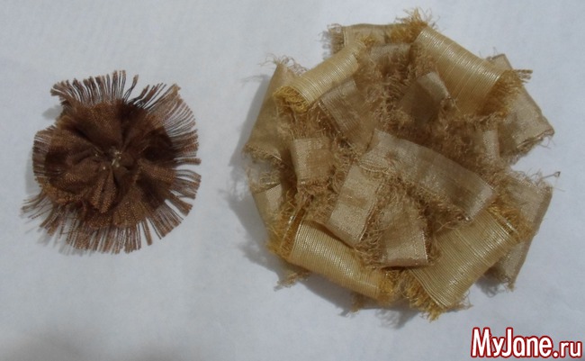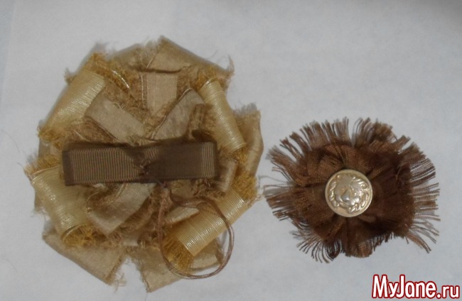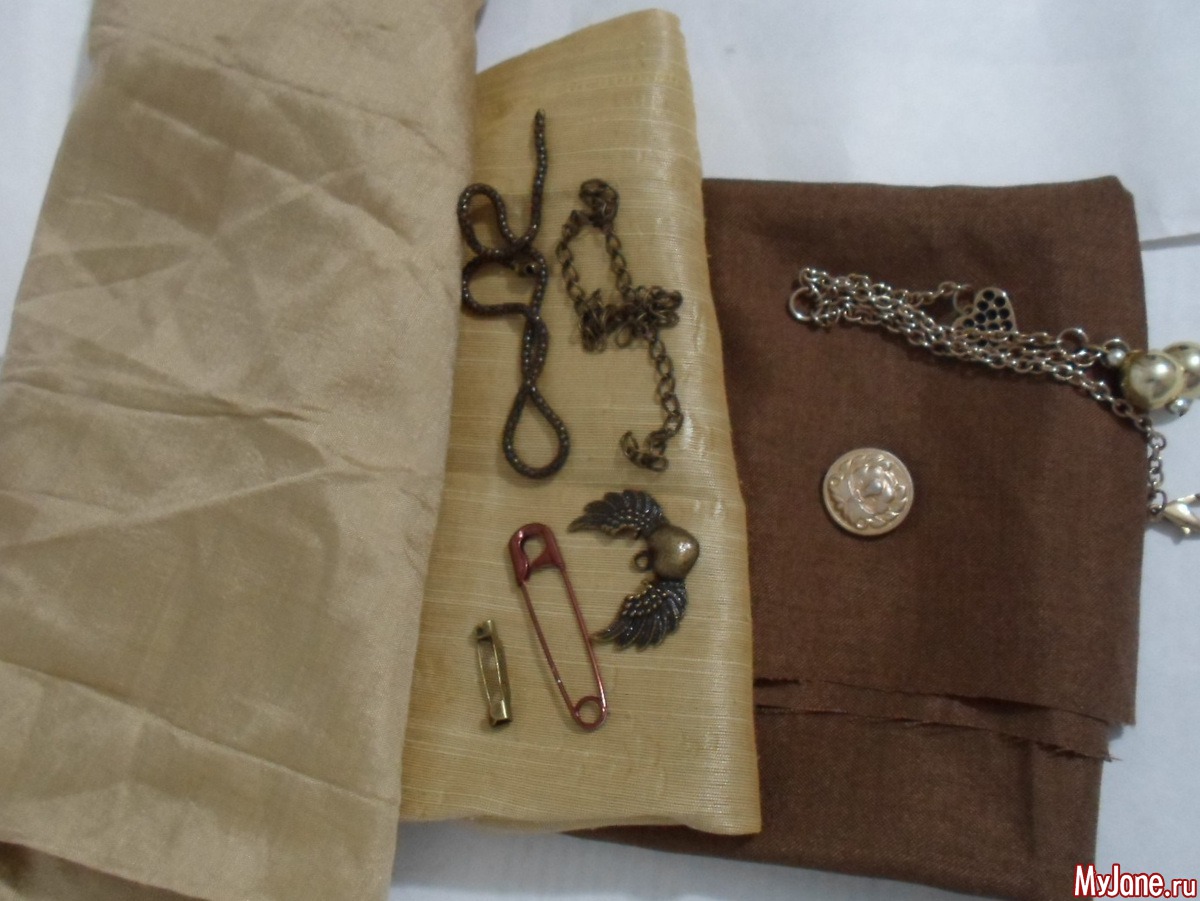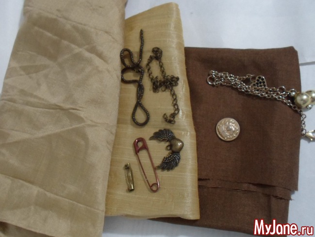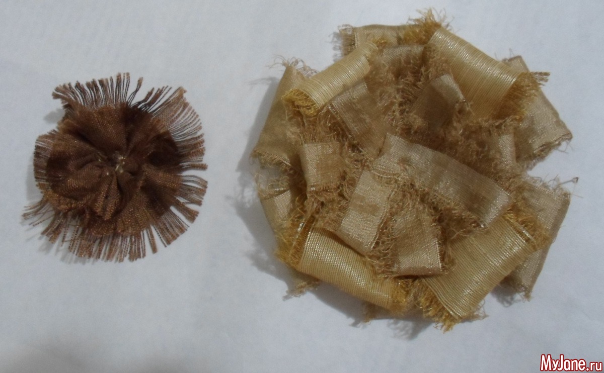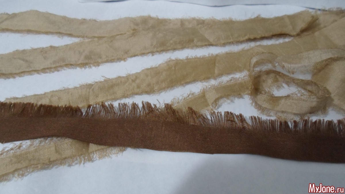 - ткани и (или) репсовые ленты подходящих оттенков: я использовала песочные и золотистые оттенки дикого шелка с добавлением вискозы и полиэстер с добавлением хлопка коричневого цвета;
