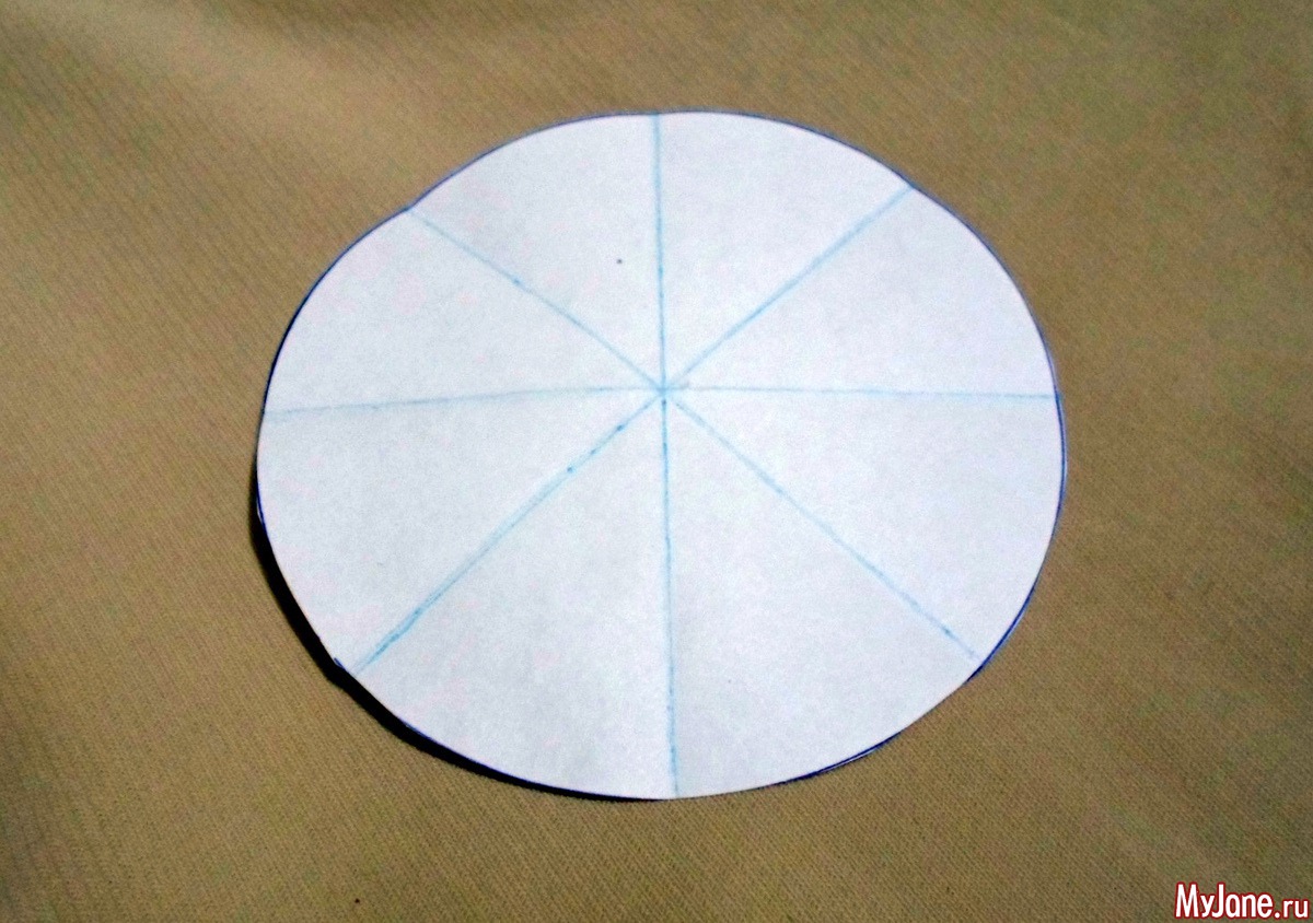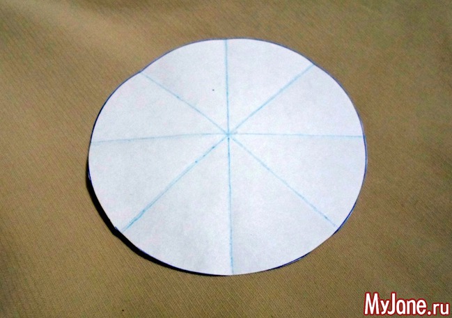 1. Определяемся с размером броши и рисуем на бумаге круг нужного диаметра. Для этого можно использовать циркуль или любой предмет имеющий форму круга. Складываем поочередно вырезанный круг таким образом, чтоб получить на бумаге следы от сгибов, каждый раз совмещая предыдущие сгибы. Круг можно разделить на сектора и при помощи транспортира. Этот шаблон пригодится для контроля размера броши и направлений полосок ткани при формировании броши.